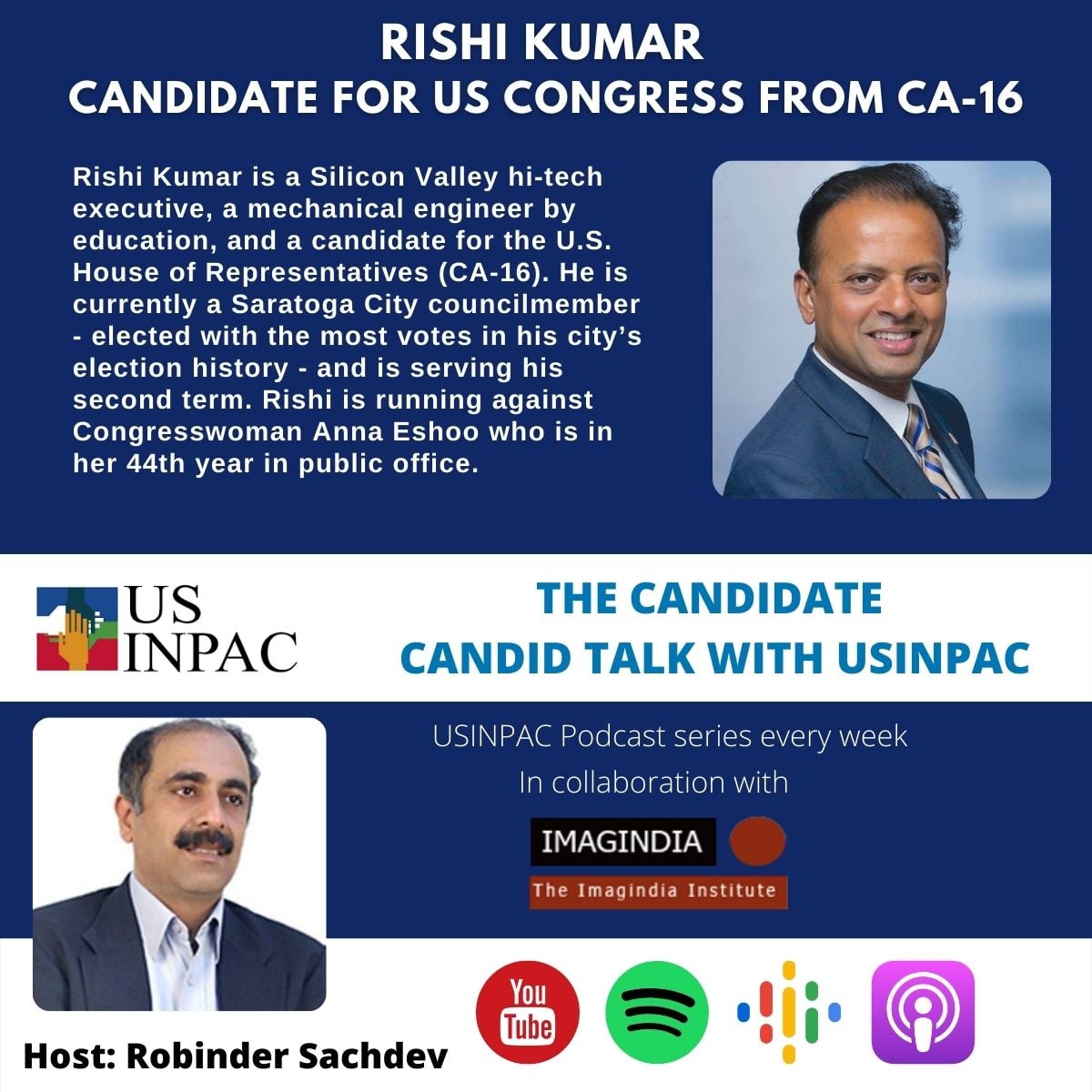 Rishi Kumar is a Silicon Valley hi-tech executive, a mechanical engineer by education, and a candidate for the U.S. House of Representatives (CA-16). He is currently a Saratoga City councilmember – elected with the most votes in his city’s election history – and is serving his second term. Rishi is running against Congresswoman Anna Eshoo who is in her 44th year in public office.